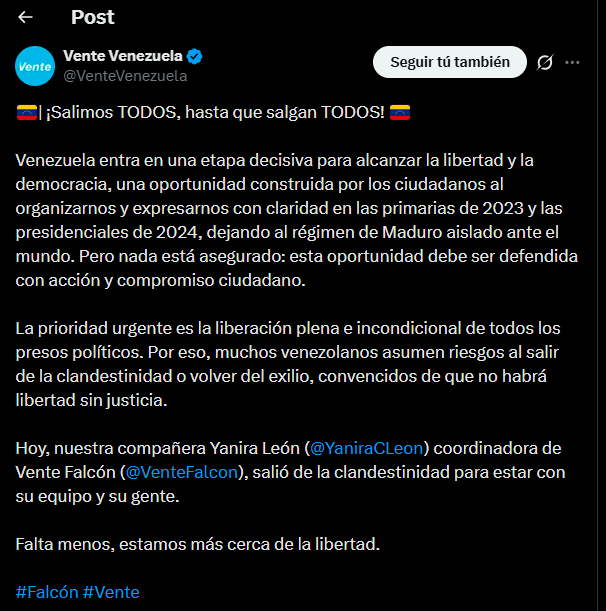 En un contexto político crítico en Venezuela, el partido Vente Venezuela lanzó un mensaje de movilización a través de su cuenta oficial en X (antes Twitter) bajo el lema “¡Salimos TODOS, hasta que salgan TODOS!”, en alusión a la exigencia de libertad plena e incondicional de los presos políticos en el país.