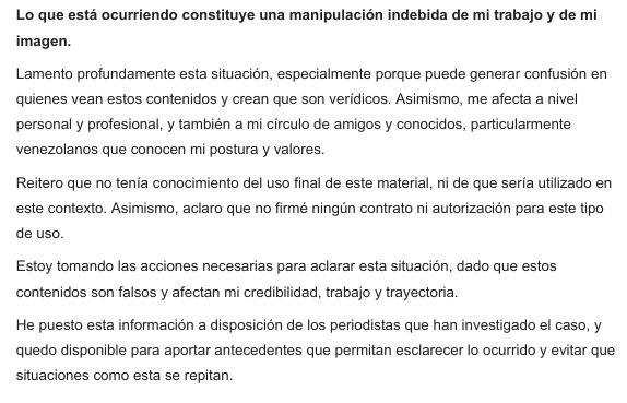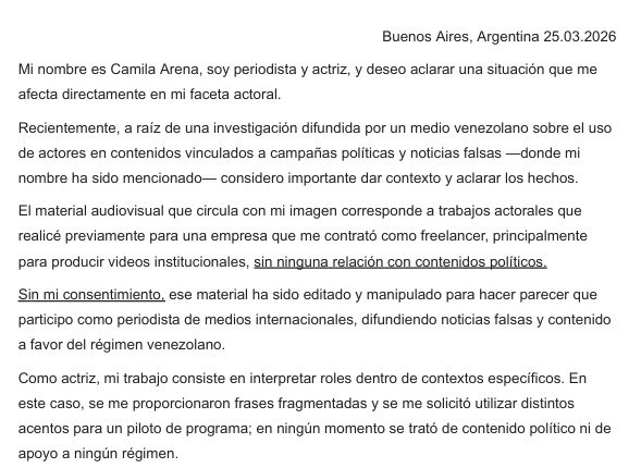 Una de las actrices argentinas identificadas en la operación de influencia “Hispan Online” publicó la noche del miércoles 25 de marzo una carta abierta en su cuenta de Instagram y una serie de declaraciones en video en las que denuncia el uso indebido de su imagen en contenidos propagandísticos vinculados al gobierno de Venezuela. La operación fue investigada por Cazadores de Fake News en varias entregas publicadas desde el 13 de marzo.