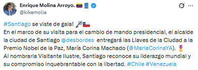 Este jueves 12 de marzo, el alcalde de Santiago, Mario Desbordes, entregaría las llaves de la ciudad a la líder de oposición venezolana, María Corina Machado.
