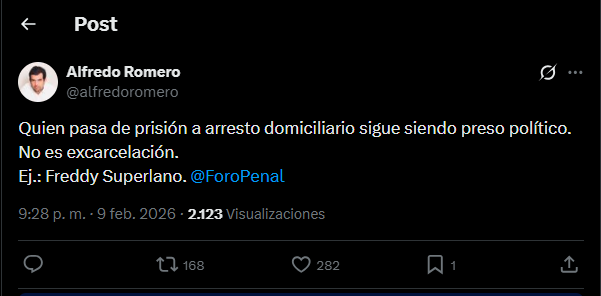 A través de su cuenta oficial en la red social X, Romero fue enfático al señalar que “quien pasa de prisión a arresto domiciliario sigue siendo preso político. No es excarcelación”, en referencia a medidas aplicadas con algunos excarcelados el domingo 8 de febrero.