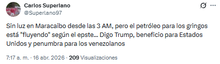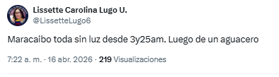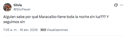 Desde la madrugada de este 16 de abril, vecinos de algunos sectores de Maracaibo denunciaron a través de X una interrupción del servicio eléctrico.