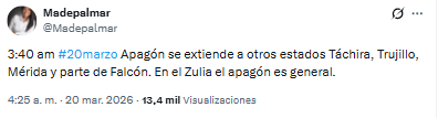 De acuerdo con los reportes compartidos por la periodista Madelyn Palmar a las 3:40 a.m., la falla eléctrica afectó de manera total a la región zuliana, mientras que en Táchira, Trujillo, Mérida y sectores de Falcón se registran algunas interrupciones.