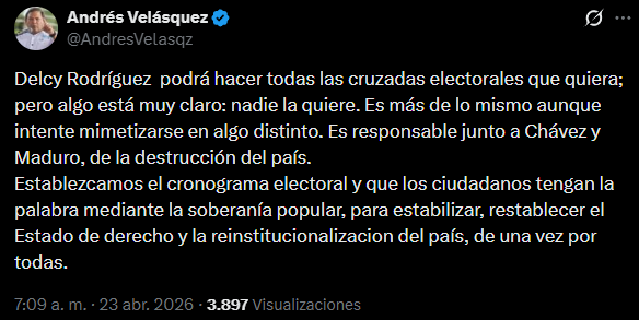 «Delcy Rodríguez podrá hacer todas las cruzadas electorales que quiera, pero algo está muy claro: nadie la quiere», enfatizó Velásquez en sus redes sociales.