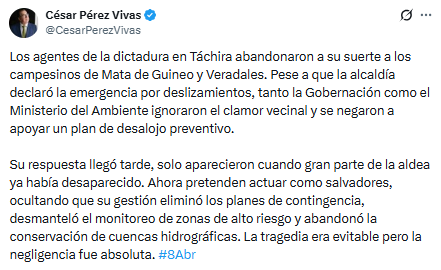 El exgobernador del estado Táchira, César Pérez Vivas, cuestionó al régimen en la entidad, señalando que su respuesta llegó tarde: «solo aparecieron cuando gran parte de la aldea ya había desaparecido. Ahora pretenden actuar como salvadores, ocultando que su gestión eliminó los planes de contingencia, desmanteló el monitoreo de zonas de alto riesgo y abandonó la conservación de cuencas hidrográficas. La tragedia era evitable pero la negligencia fue absoluta».
