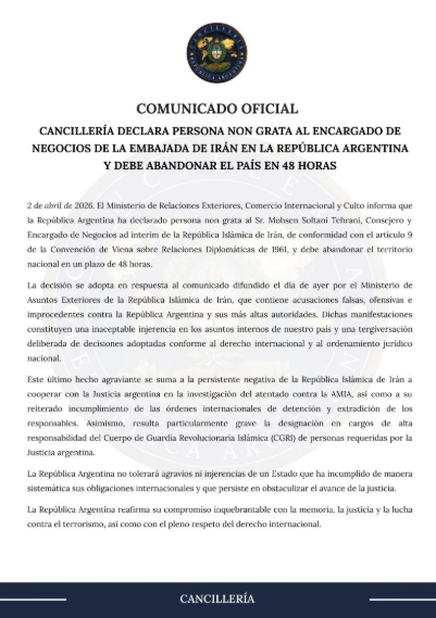 «El Ministerio de Relaciones Exteriores, Comercio Internacional y Culto informa que la República Argentina ha declarado ‘persona non grata’ al Sr. Mohsen Soltani Tehrani, Consejero y Encargado de Negocios ‘ad interim’ de la República Islámica de Irán, de conformidad con el artículo 9 de la Convención de Viena sobre Relaciones Diplomáticas de 1961, y debe abandonar el territorio nacional en un plazo de 48 horas», señaló el organismo en el comunicado oficial.