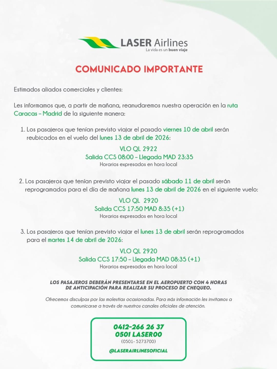 La aerolínea venezolana Laser Airlines informó este domingo que reanudará su operación en la ruta Caracas–Madrid a partir del lunes 13 de abril de 2026, tras una serie de ajustes que obligaron a reprogramar a pasajeros afectados en días previos.