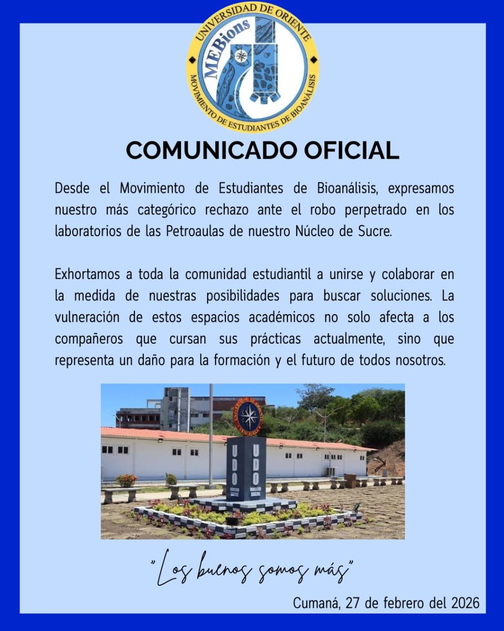En este sentido, el Movimiento de Estudiantes de Bioanálisis (Mebions), a través de un comunicado, expresó su rechazo al «robo perpetrado en los laboratorios de las Petroaulas de nuestro Núcleo de Sucre».