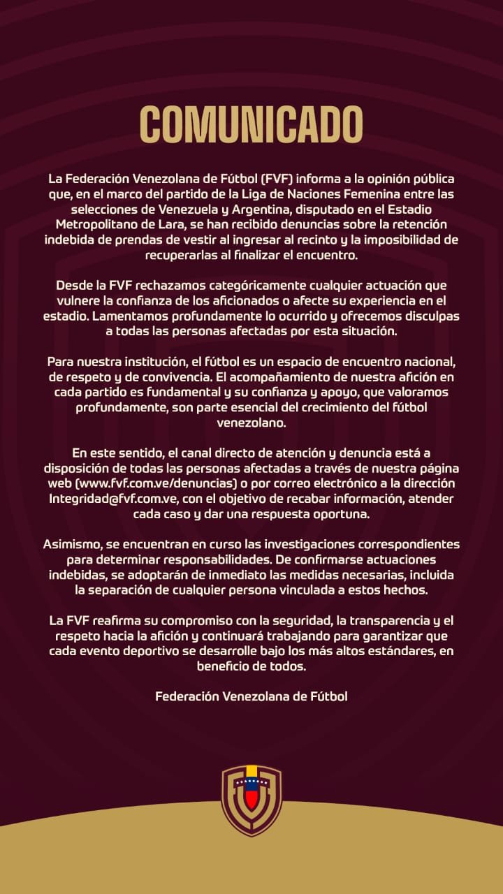Ante lo ocurrido, la Federación Venezolana de Fútbol (FVF) emitió un comunicado en su perfil de X en el que confirmó haber recibido denuncias sobre la “retención indebida de prendas de vestir” y la “imposibilidad de recuperarlas” tras el partido de la Liga de Naciones Femenina.