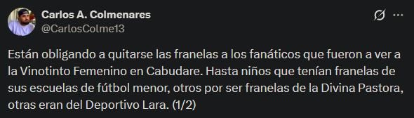 En uno de los videos, un hincha cuestionó a un funcionario por negarle el acceso con una camiseta alusiva a la Divina Pastora. “¿Por qué la Divina Pastora no puede entrar?”, reclamó el hombre, antes de ser obligado a quitarse la prenda para poder ingresar al estadio.
