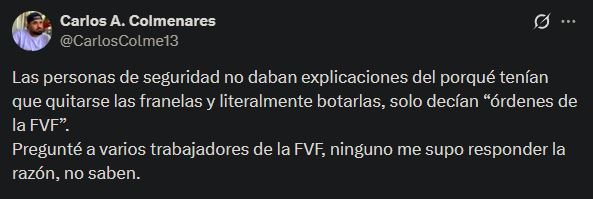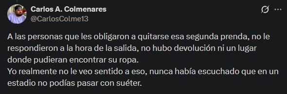 De acuerdo con varios reportes del periodista Carlos Colmenares en su cuenta de X, los señalamientos apuntaron a que el personal de seguridad en los accesos al recinto impidió el ingreso de personas, incluidos niños, que portaban más de una prenda superior —como franelas, suéteres o franelillas— obligándolos a despojarse de alguna de ellas sin garantía de recuperación posterior.
