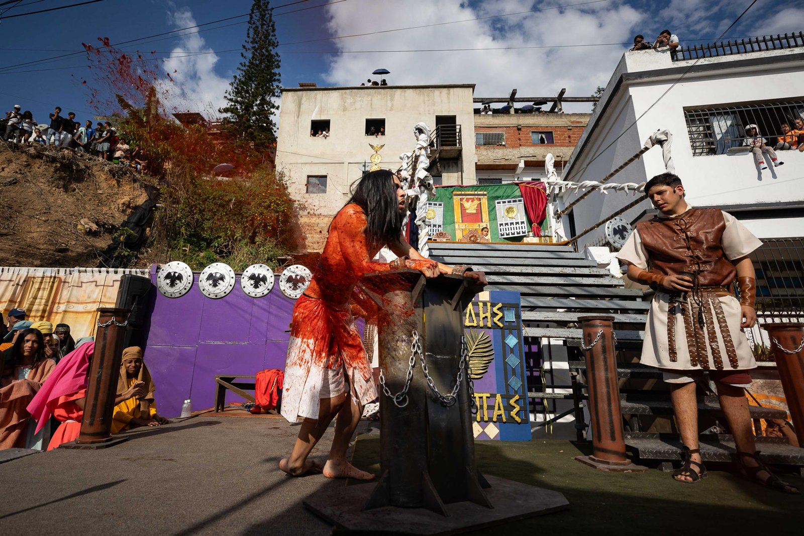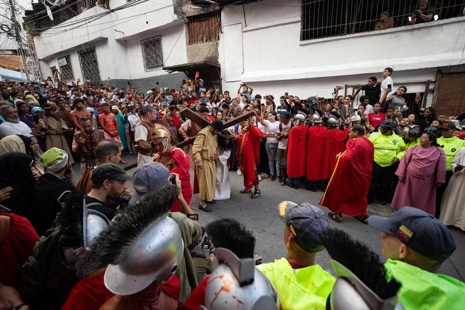 Por las calles de la barriada caraqueña, un grupo de actores jóvenes -residentes de esta comunidad- representaron los últimos momentos de Cristo, narrados en la Biblia, ante la mirada de cientos de personas que se conmovieron con la actuación de los personajes.