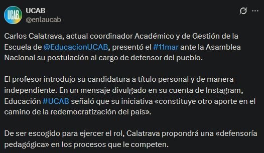 De acuerdo con una publicación en X, la Ucab indicó que Calatrava introdujo su candidatura a título personal y de manera independiente.