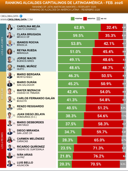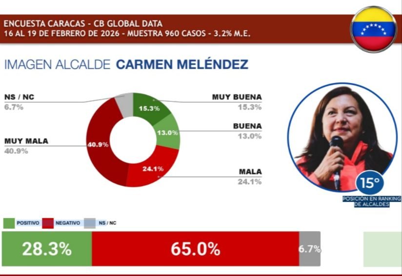 La alcaldesa de Caracas, Carmen Meléndez, se encuentra entre las figuras peores evaluadas del reciente Ranking de Alcaldes Capitalinos de Latinoamérica – Febrero 2026, elaborado por la firma CB Global Data.