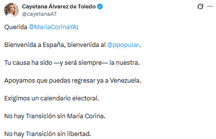 A través de su cuenta en X, Álvarez de Toledo reafirmó el compromiso con la causa democrática venezolana y aseguró que el apoyo a Machado ha sido y será una constante para el Partido Popular. «Tu causa ha sido —y será siempre— la nuestra», dijo.