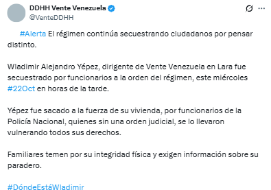 “Wladimir Alejandro Yépez, dirigente de Vente Venezuela en Lara fue detenido por funcionarios a la orden del Estado, este miércoles 22 de octubre en horas de la tarde”, publicó el Comité en su cuenta de X.