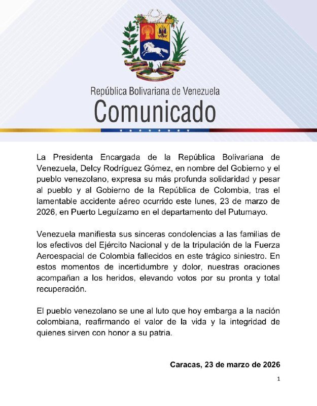 «La Presidenta Encargada de la República Bolivariana de Venezuela, Delcy Rodríguez Gómez, en nombre del Gobierno y el pueblo venezolano, expresa su más profunda solidaridad y pesar al pueblo y al Gobierno de la República de Colombia, tras el lamentable accidente aéreo ocurrido este lunes, 23 de marzo de 2026, en Puerto Leguízamo en el departamento del Putumayo», reza el texto.