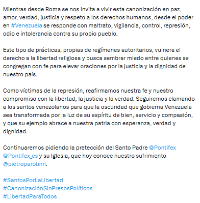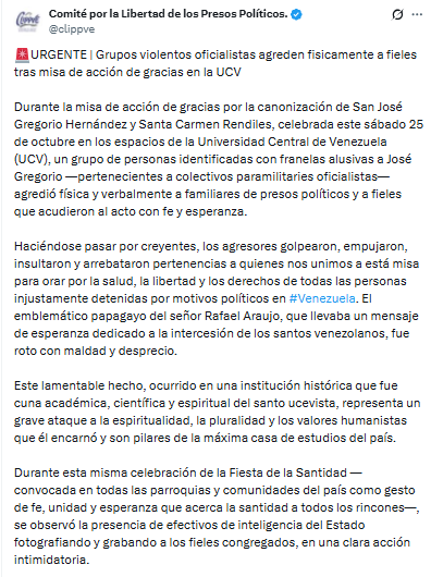 El Comité por la Libertad para los Presos Políticos de Venezuela denunció que chavistas agredieron familiares de presos políticos durante la misa de acción de gracias por la canonización de San José Gregorio Hernández y Santa Carmen Rendiles, celebrada este sábado 25 de octubre en los espacios de la Universidad Central de Venezuela (UCV).