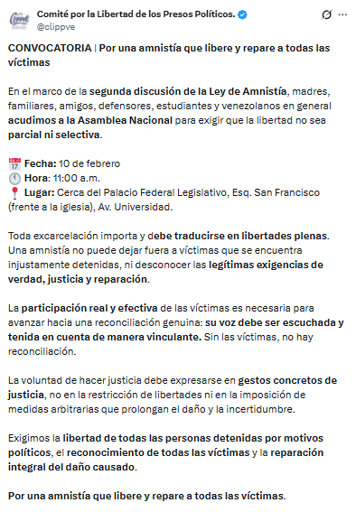 El Comité por la Libertad de los Presos Políticos convocó a una movilización este martes 10 de febrero a las 11:00 a.m. en las inmediaciones del Palacio Federal Legislativo.