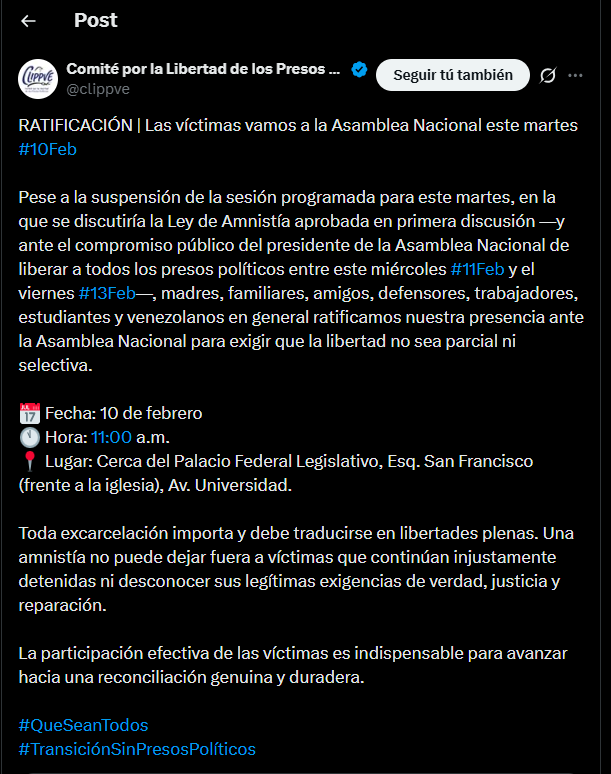 El Comité por la Libertad de los Presos Políticos (Clippve) ratificó la noche de este lunes 9 de febrero de 2026 su convocatoria a una concentración frente a la Asamblea Nacional, pautada para este martes 10 de febrero, con el objetivo de exigir la liberación plena y no selectiva de todos los presos políticos en Venezuela.