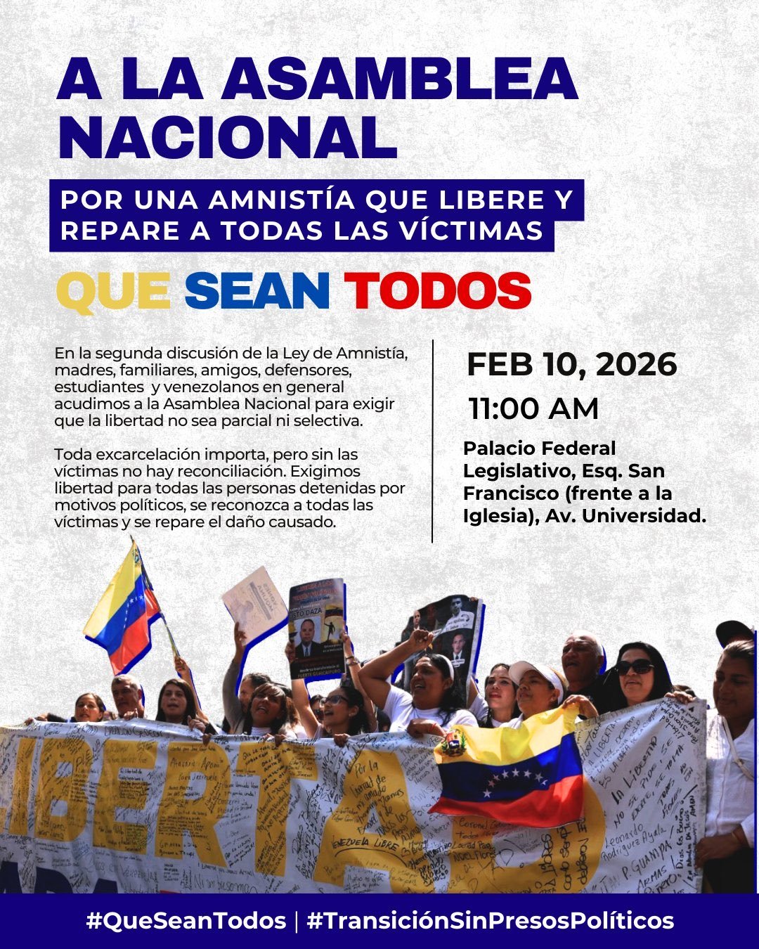 Clippve recordó que existe un compromiso público del presidente de facto de la Asamblea Nacional chavista, Jorge Rodríguez, de liberar a todos los presos políticos entre el miércoles 11 y el viernes 13 de febrero, razón por la cual madres, familiares, amigos, defensores de derechos humanos, trabajadores, estudiantes y ciudadanos en general acudirán a las inmediaciones del Palacio Federal Legislativo para exigir que dicho compromiso se cumpla sin exclusiones.