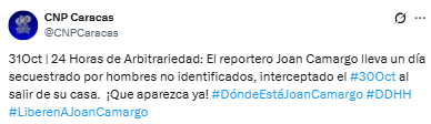 El Colegio Nacional de Periodistas (CNP) denunció que el reportero de sucesos Joan Camargo lleva 24 horas desaparecido, luego de ser interceptado por hombres no identificados al salir de su residencia en Caracas la mañana del 30 de octubre.