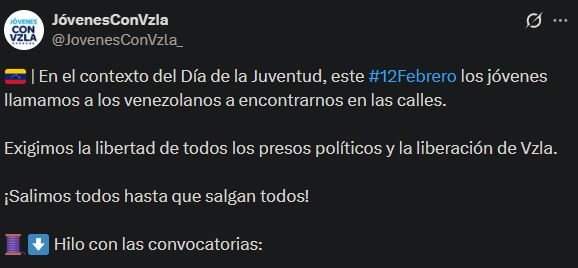 «En el contexto del Día de la Juventud, este #12Febrero los jóvenes llamamos a los venezolanos a encontrarnos en las calles. Exigimos la libertad de todos los presos políticos y la liberación de Vzla. ¡Salimos todos hasta que salgan todos!», escribió.