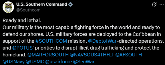 «Las fuerzas militares estadounidenses están desplegadas en el Caribe para apoyar la misión #SOUTHCOM, las operaciones dirigidas por el Departamento de Guerra y las prioridades del presidente de EEUU para desmantelar el tráfico ilícito de drogas y proteger la patria», agregó el mensaje.