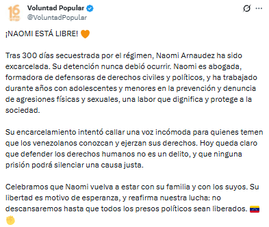 La noticia fue confirmada por el partido político Voluntad Popular, que calificó su detención como un «secuestro» por parte del chavismo y señaló que su encarcelamiento nunca debió ocurrir.