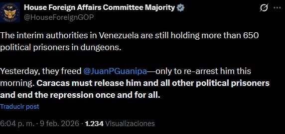 El Comité de Asuntos Exteriores de la Cámara de Representantes de Estados Unidos condenó la recaptura del dirigente opositor Juan Pablo Guanipa y exigió su liberación inmediata. La instancia legislativa se pronunció este lunes 9 de febrero para rechazar la medida ejecutada por los organismos de seguridad del régimen apenas horas después de la excarcelación del político.
