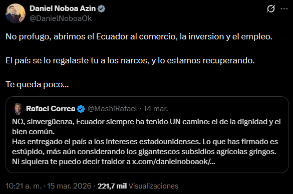 Este domingo, el jefe de Estado reaccionó a ese comentario con el mensaje en X que reza: «No prófugo, abrimos el Ecuador al comercio, la inversión y el empleo. El país se lo regalaste tú a los narcos, y lo estamos recuperando. Te queda poco», advirtió Noboa a Correa, quien ha sido condenado por corrupción y vive en Bélgica desde que terminó su mandato.