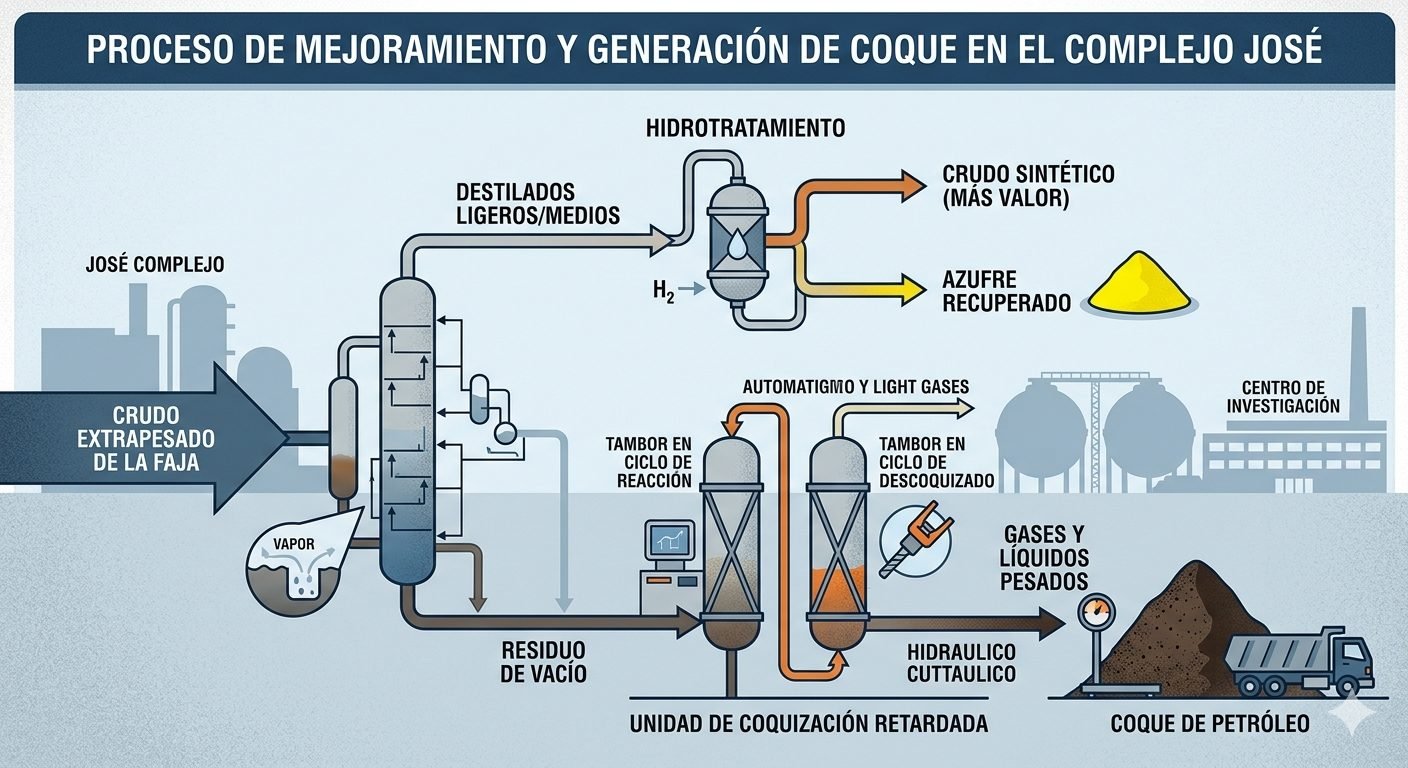 En el proceso de valorización de los crudos de la Faja Petrolífera del Orinoco, los mejoradores de Jose actúan como refinerías especializadas que transforman un crudo extrapesado, denso y rico en impurezas, en un crudo sintético de mayor valor comercial. Para lograr esta mejora en la calidad, el proceso debe literalmente «despojar» al crudo de su exceso de carbono y de sus altos contenidos de heteroátomos. El coque de petróleo es el residuo sólido resultante de la unidad de coquización retardada (delayed coking), donde se rompen las moléculas pesadas para extraer los componentes ligeros. No es una elección de producción, sino una consecuencia química: para que el crudo fluya y sea exportable, el carbono sobrante debe quedar atrás en forma de este sólido oscuro.