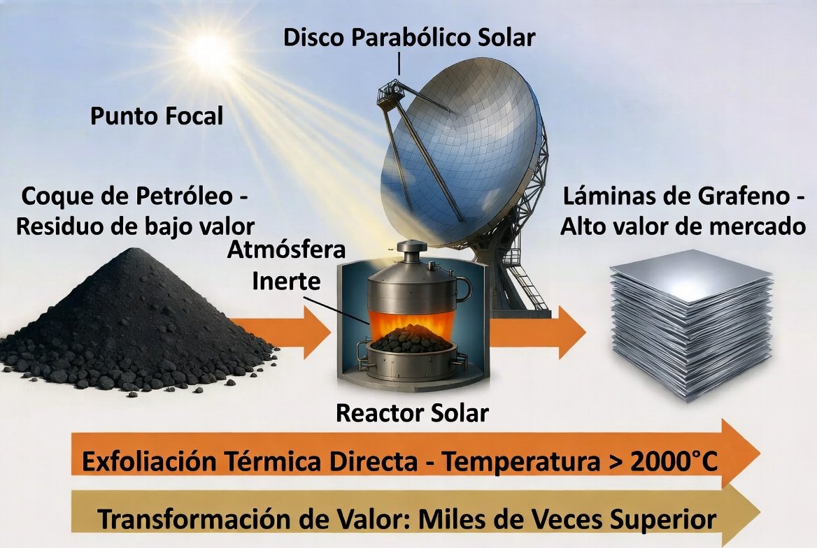 Es aquí donde surge una oportunidad única: la Química Solar de Alta Temperatura. Mediante el uso de concentradores solares (CSP), es posible alcanzar temperaturas superiores a 2000 °C de forma limpia y renovable. Esta energía térmica concentrada permite inducir una exfoliación térmica directa o grafitización controlada del coque, convirtiendo un residuo de bajo valor económico en grafeno o materiales grafénicos de alto valor, cuyo precio en el mercado puede ser miles de veces superior al del petcoke original.