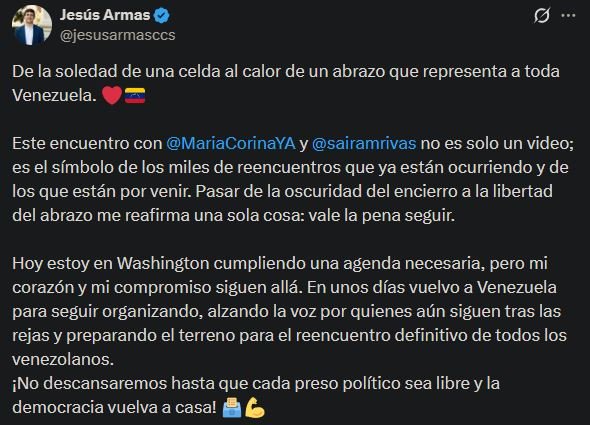 A través de su cuenta de X, Armas calificó el momento como un “símbolo” de los miles de reencuentros que se están dando entre venezolanos tras las recientes excarcelaciones de presos políticos y la recuperación de libertades por parte de muchos que han salido de prisión.