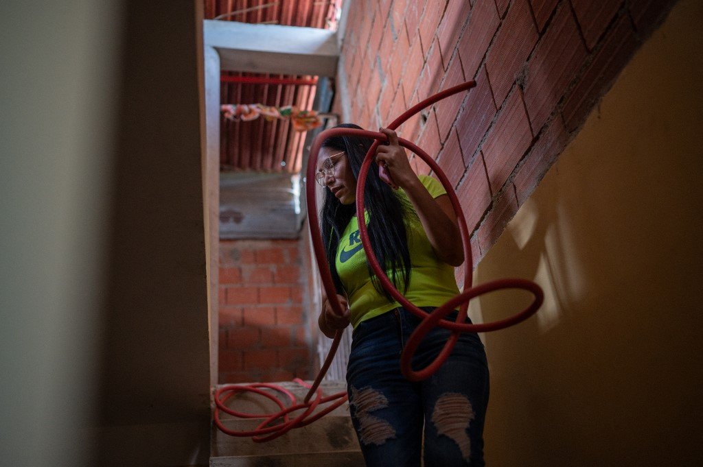 Yusmary Gómez, de 36 años, sostiene una manguera para recolectar agua en recipientes de plástico debido a la escasez de agua, en su casa en el barrio de La Vega en Caracas, el 9 de agosto de 2023. Yusmary ha venido a gastar en agua la mitad del dinero que gana a la semana. Isora acude al mercado negro de bombonas de gas para cocinar. Rodrigo, entre apagones, compró plantas eléctricas para su casa y negocio. (Foto de Federico PARRA / AFP)