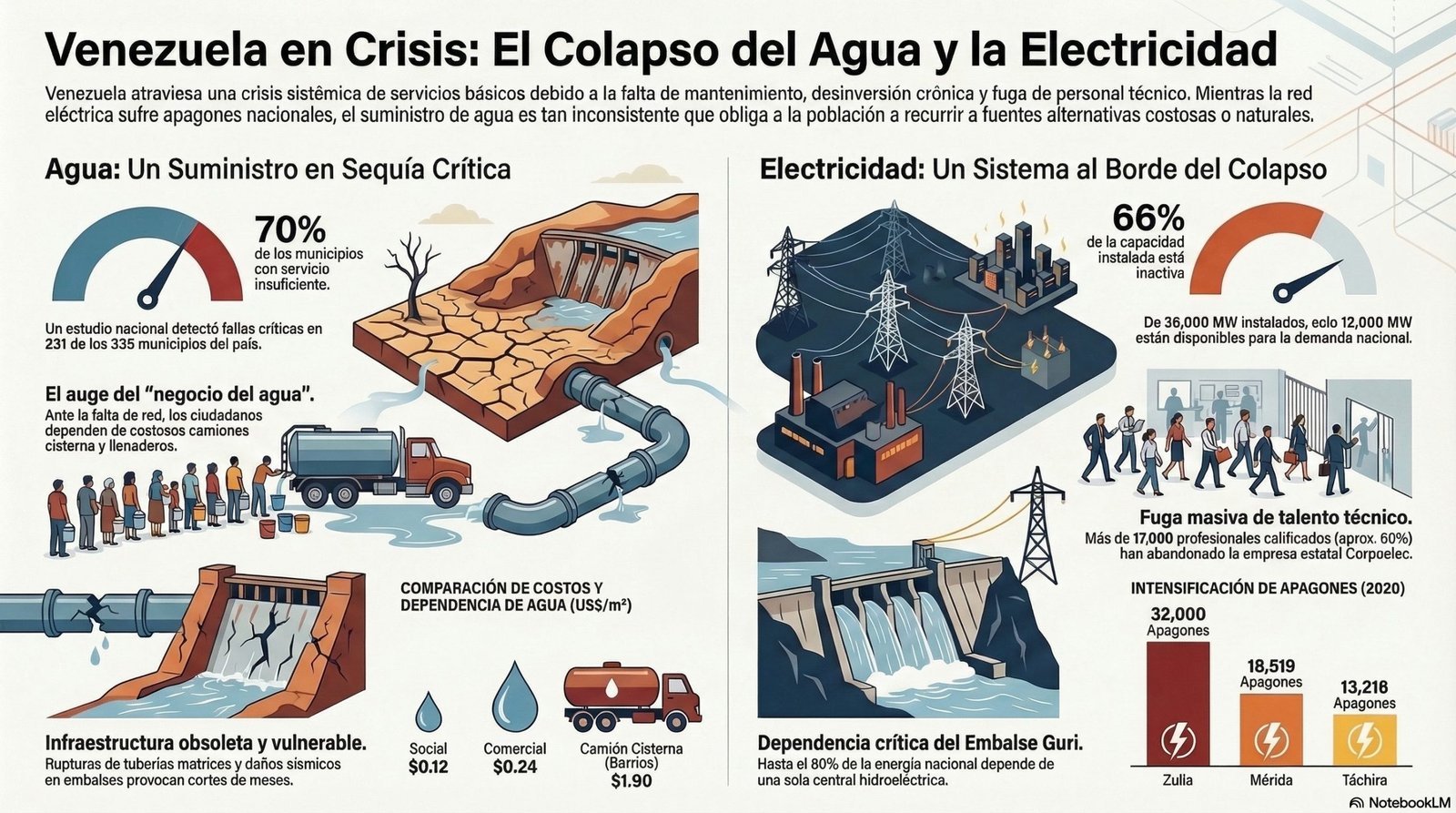 El colapso de los servicios públicos en Venezuela, particularmente de agua y electricidad, responde a una combinación de falta de inversión, fallas en el mantenimiento, corrupción, pérdida de personal técnico y factores climáticos.