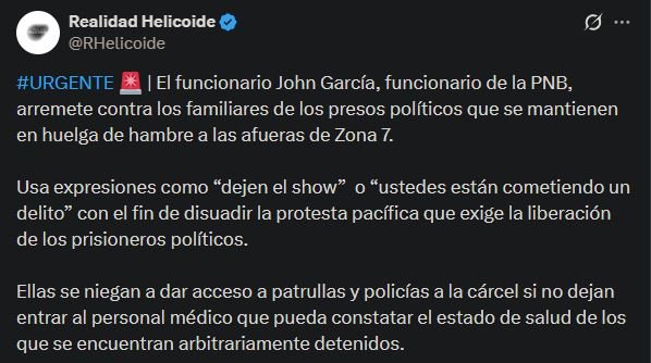 A través de un video compartido en X por Realidad Helicoide, el uniformado, identificado como John García, utilizó expresiones como “dejen el show” y acusó a los familiares de “cometer un delito” por mantenerse firmes y no permitir el ingreso de efectivos hasta que se constate la salud de los reclusos.