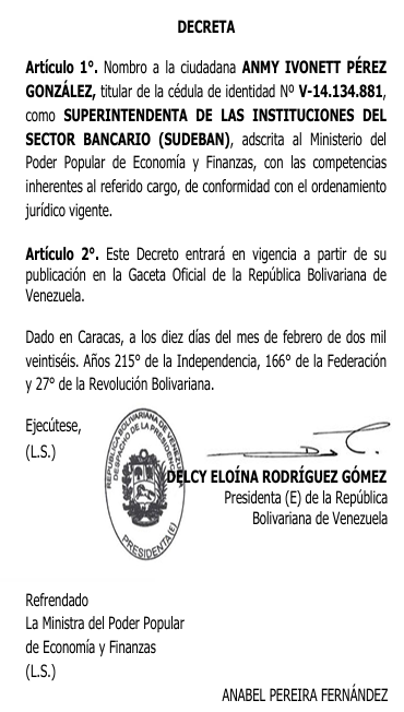 Delcy Rodríguez designó a la desconocida Anmy Ivonett Pérez González como superintendenta de Sudeban, máxima autoridad del sector bancario en Venezuela.