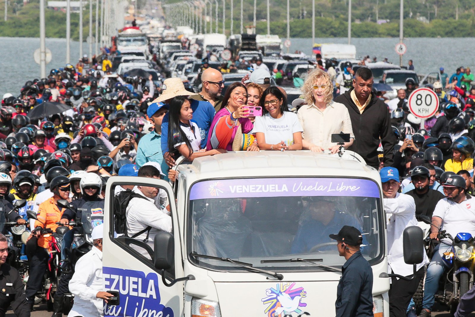 Delcy ordenó cerrar arbitrariamente el puente sobre el Lago de Maracaibo, estado Zulia, para tomarse una fotografía con su militancia para aparentar apoyo popular en su «gran peregrinación nacional» que pidió el cese de las sanciones económicas contra el chavismo.