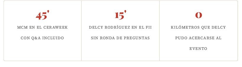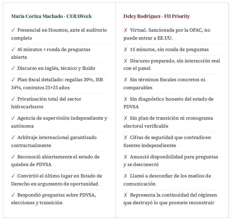 A veces la historia tiene buen sentido del tiempo. En menos de 24 horas, y sin que nadie lo hubiera planeado así, el mundo de las inversiones energéticas pudo ver cara a cara las dos propuestas de Venezuela: la de una lideresa en Houston, presente en el escenario, respondiendo preguntas en inglés ante las empresas más poderosas del sector; y la de una funcionaria en Miami que apareció en pantalla durante 15 minutos, leyó sus cifras, anunció que estaba «a la disposición para las preguntas» y se desconectó.