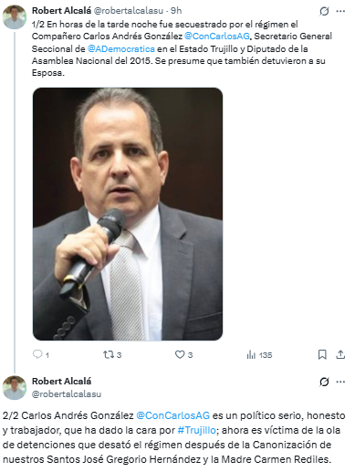El abogado y dirigente político Robert Alcalá denunció la detención arbitraria del diputado Carlos Andrés González, Secretario General Seccional del partido Acción Democrática (AD) en el estado Trujillo y miembro de la Asamblea Nacional electa en 2015.