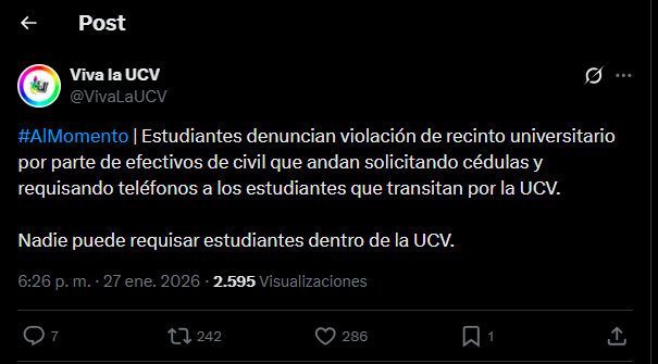 Estudiantes de la Universidad Central de Venezuela (UCV) denunciaron este martes 27 de enero por la noche una presunta violación al recinto universitario por parte de efectivos de civil, quienes, según reportes difundidos en la cuenta oficial de X, @VivalaUCV, habrían interceptado estudiantes, solicitando cédulas de identidad y requisando teléfonos móviles a quienes transitaban por el campus.