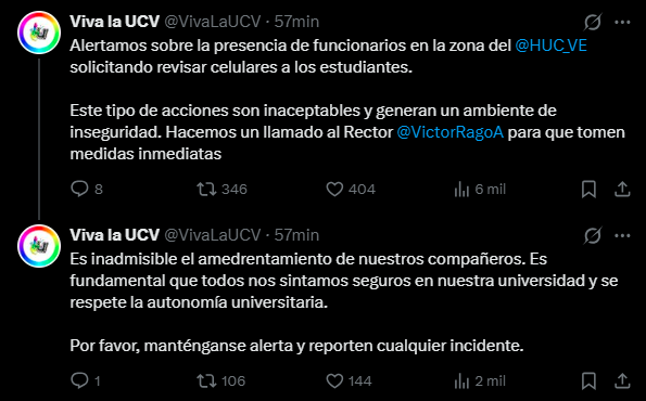 «Este tipo de acciones son inaceptables y generan un ambiente de inseguridad. Hacemos un llamado al Rector, Victor Rago, para que tomen medidas inmediatas. Es inadmisible el amedrentamiento de nuestros compañeros. Es fundamental que todos nos sintamos seguros en nuestra universidad y se respete la autonomía universitaria», manifestó el movimiento estudiantil.