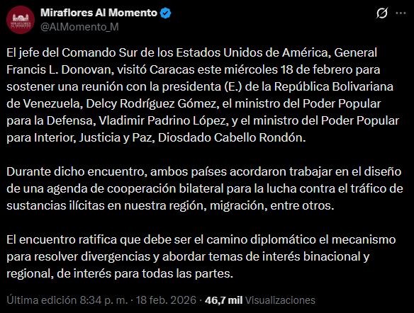 El general Francis L. Donovan, jefe del Comando Sur, aterrizó de sorpresa en Venezuela el pasado miércoles para encontrarse con Delcy Rodríguez, el general chavista Vladimir Padrino López y el propio Cabello.