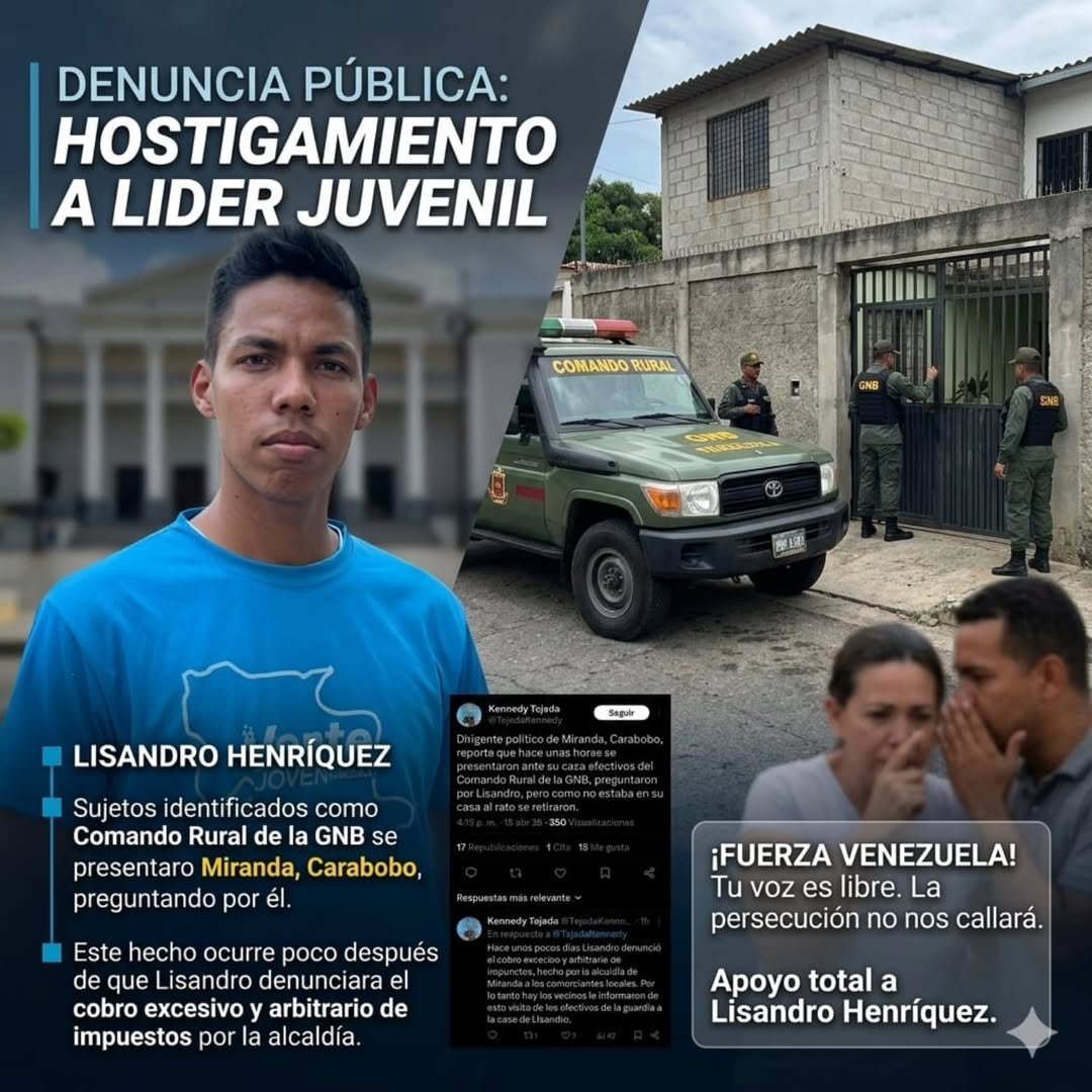 El expreso político Lisandro Henríquez denunció hostigamiento por parte de funcionarios de la Guardia Nacional Bolivariana (GNB), en el municipio Miranda, tras exponer en redes sociales un caso de cobro arbitrario de las autoridades locales hacia un comerciante.