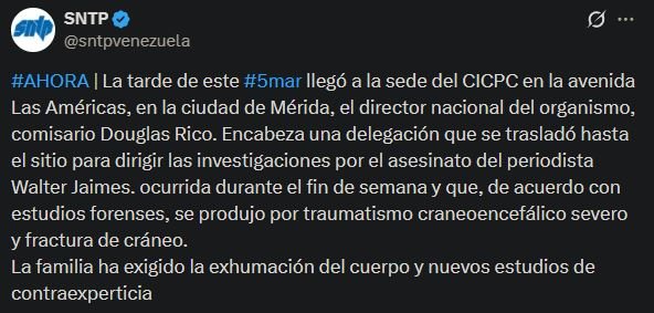 El Sindicato Nacional de Trabajadores de la Prensa de Venezuela (Sntp) informó este jueves sobre la llegada al estado Mérida del director del Cuerpo de Investigaciones Científicas, Penales y Criminalísticas (Cicpc), Douglas Rico, para dirigir las investigaciones por el asesinato del periodista Walter Jaimes.