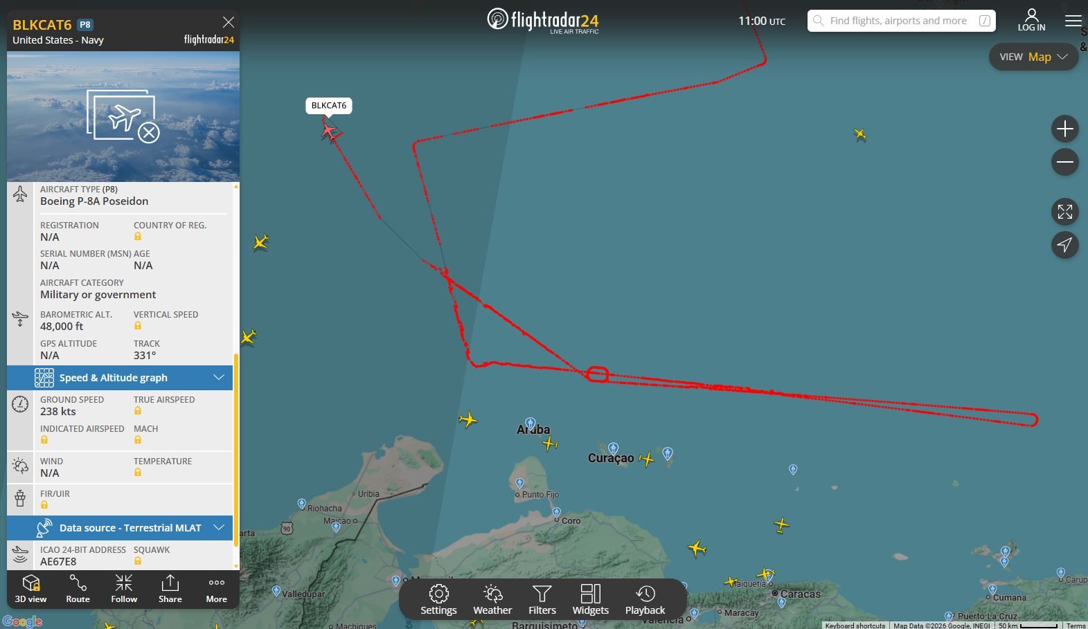 Aunque es probable que el aparato despegara originalmente desde la Base Aérea de Jacksonville en Florida, el rastreador digital FlightRadar24 solo registró el encendido de su transpondedor cuando se ubicaba al sur de Puerto Rico.