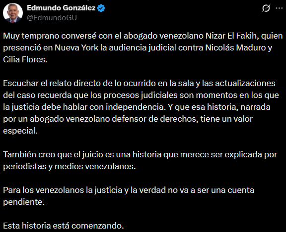 «Muy temprano conversé con el abogado venezolano Nizar El Fakih, quien presenció en Nueva York la audiencia judicial contra Nicolás Maduro y Cilia Flores», comentó González en sus redes sociales.