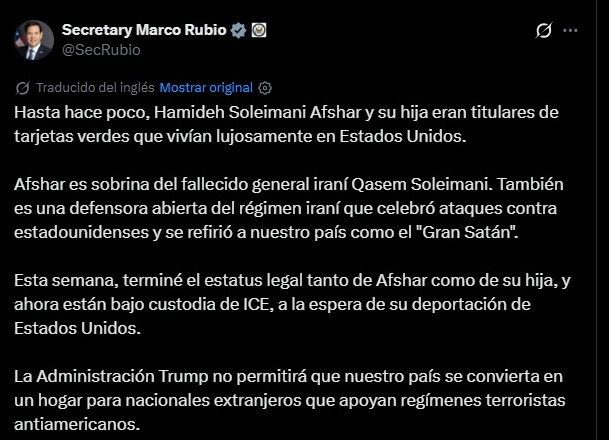 «La sobrina y la sobrina-nieta del fallecido general de división del Cuerpo de la Guardia Revolucionaria Iraní, Qasem Soleimaní, fueron detenidas por agentes federales tras la revocación de su estatus de residentes permanentes legales (LPR) por parte del secretario de Estado, Marco Rubio», afirmó el Departamento en un comunicado.