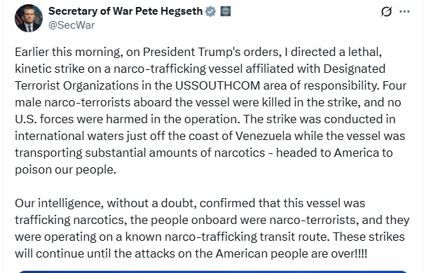 El secretario de Guerra de Estados Unidos, Pete Hegseth, confirmó este viernes 3 de octubre la ejecución de un operativo militar en aguas internacionales cercanas a la costa de Venezuela, que resultó en la muerte de cuatro personas a bordo de una embarcación. La acción fue realizada por orden directa del presidente Donald Trump.