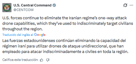 A través de X, las fuerzas estadounidenses informaron que continúan ejecutando operaciones para eliminar estas amenazas tecnológicas, las cuales son utilizadas por Teherán y sus aliados para hostigar puntos estratégicos.